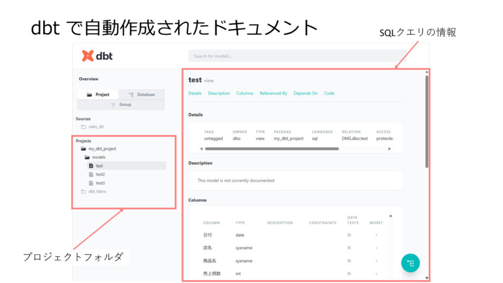 構成定義ファイル にドキュメント情報も記述することで dbt でドキュメントを自動作成することができます。