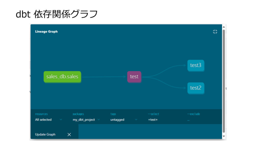dbt のドキュメントでは、各モデルがどのテーブルやモデルに依存しているかの「依存関係グラフ」も表示できます。