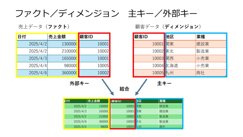 このように、ファクト・データに含まれる 顧客ID のデータ列のことを 外部キー と呼びます。