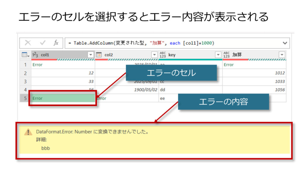 クエリを Power Query エディターで開いて、エラーが発生しているセルを選択すると、図のようにエラー内容が表示されます。