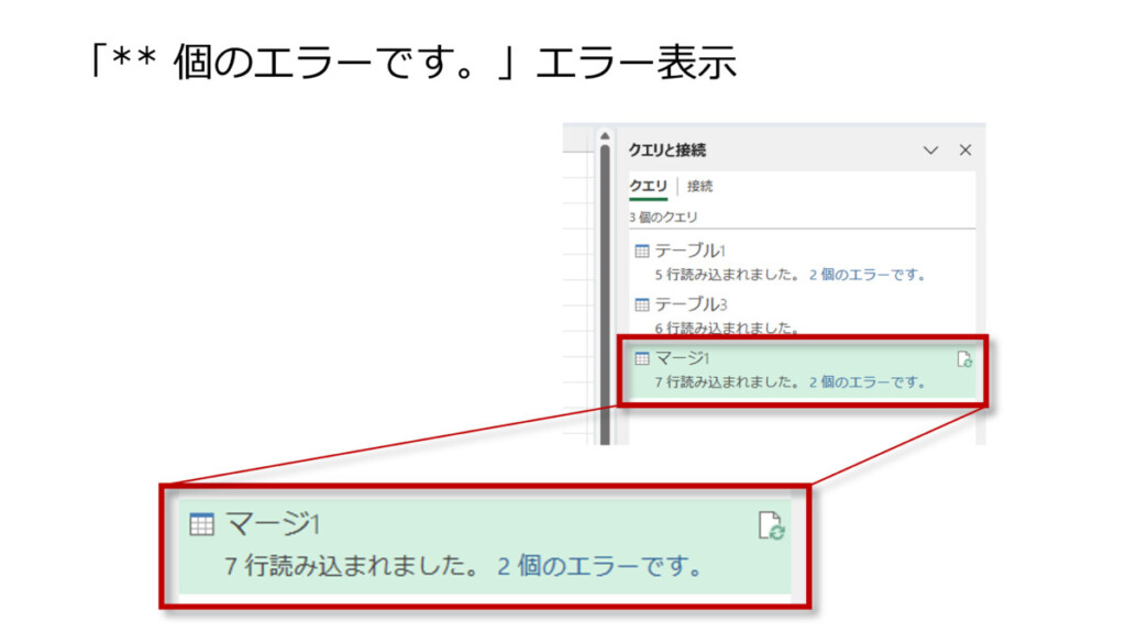 セルレベルのエラーが発生するとクエリは一通り処理されますが、「クエリと接続」のウィンドウを見ると図のようにエラーの件数が表示されます。