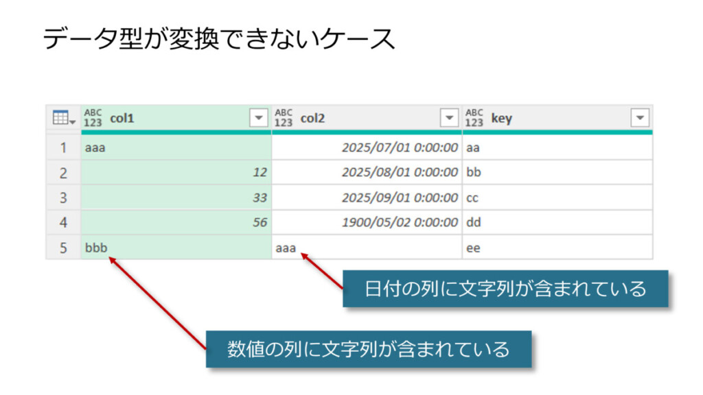 Power Query で最もよくあるエラーの一つとして、データ型の変換エラーがあります。サンプルのケースを図に示します。