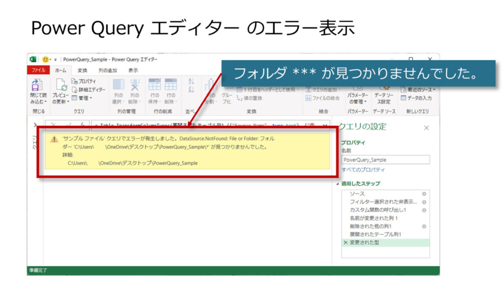 エラーが発生しているクエリをダブルクリックして Power Query エディターを開きます。すると図のように黄色いボックスにエラーの内容が表示されます。