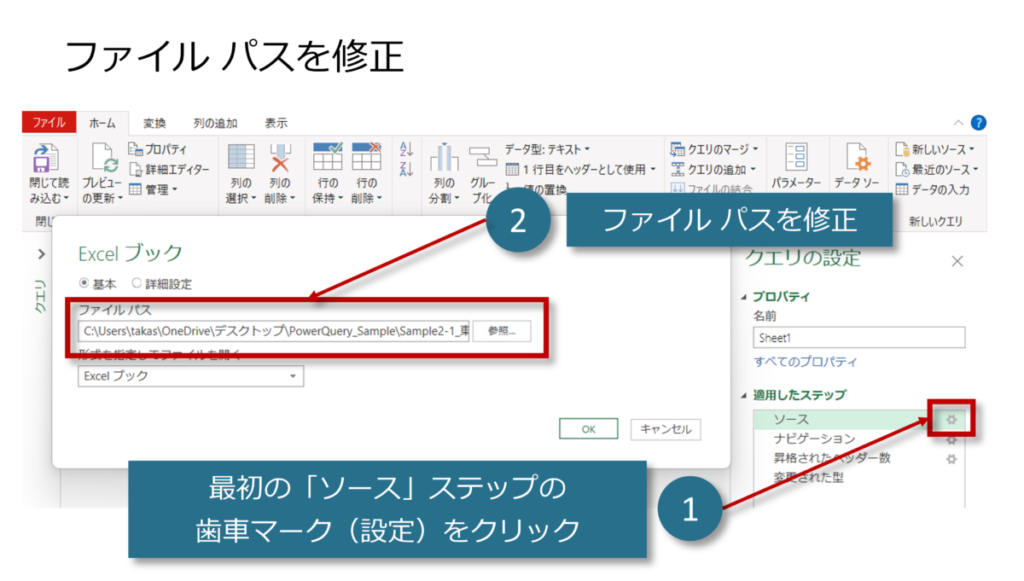 ファイルの読み込みでエラーが発生している場合は図のように最初の「ソース」というステップに移動しますので、図のようにしてファイル パスを修正して ファイルの正しい保存場所を指定 します。