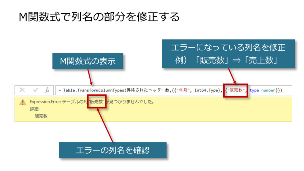 M関数式は難しくて理解できなくても、エラーになっている列名を正しくする程度の修正であれば簡単にできます。