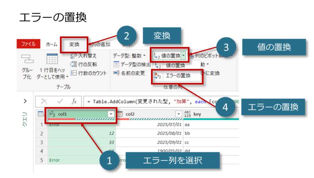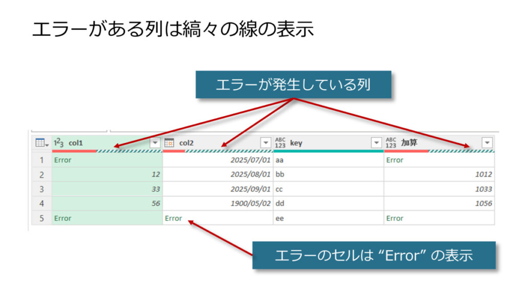 セルレベルエラーが発生したクエリを Power Query エディターで開くと、図のような表示になっています。