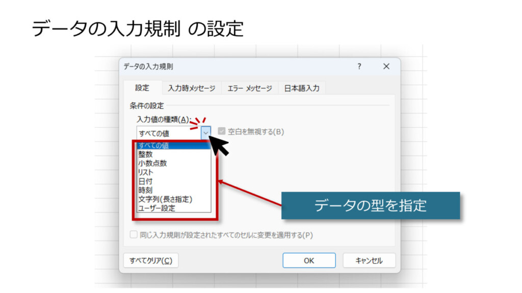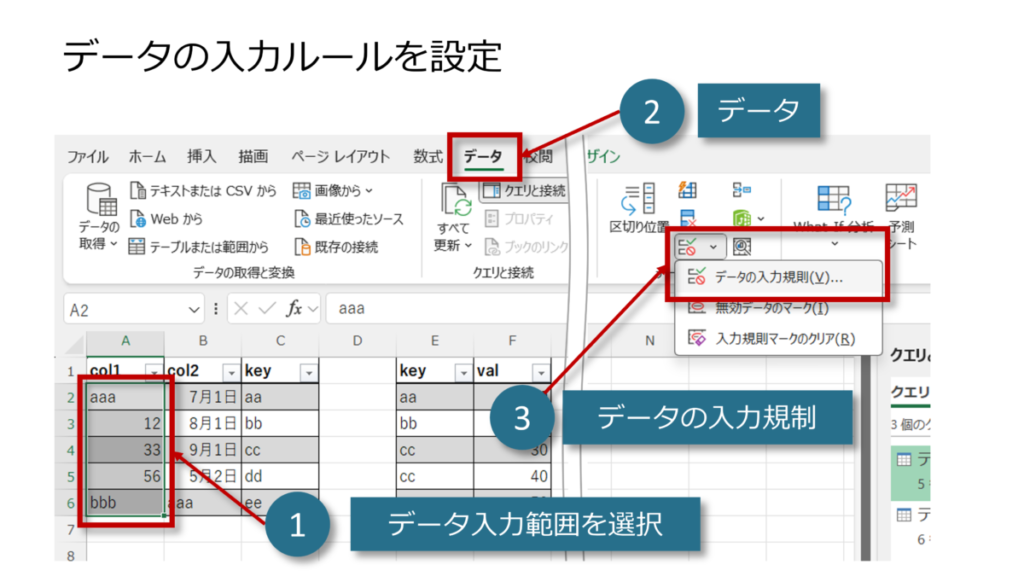 元データが Excel ファイルで人の手でデータを入力している場合は、データの入力範囲にルールを設定する という対策があります。