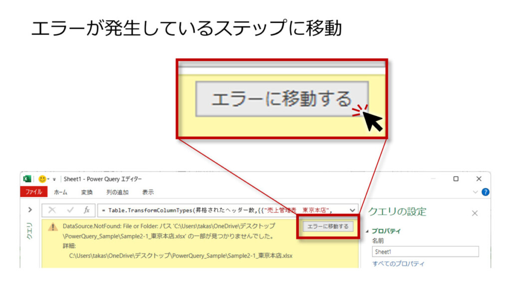 エラーが発生した場合は、そのクエリを Power Query エディターで開いて原因を調べていきます。