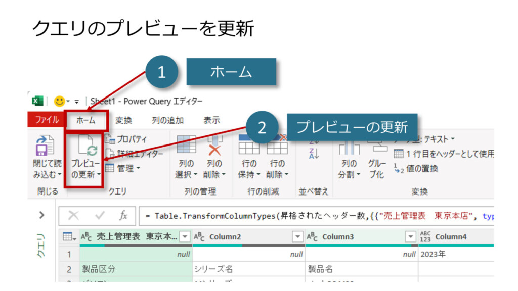 クエリを修正したら、Excelのメニューから「データ」>「すべて更新」とすることでクエリが再実行されて更新されます。