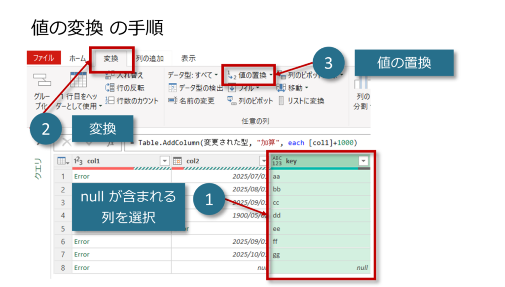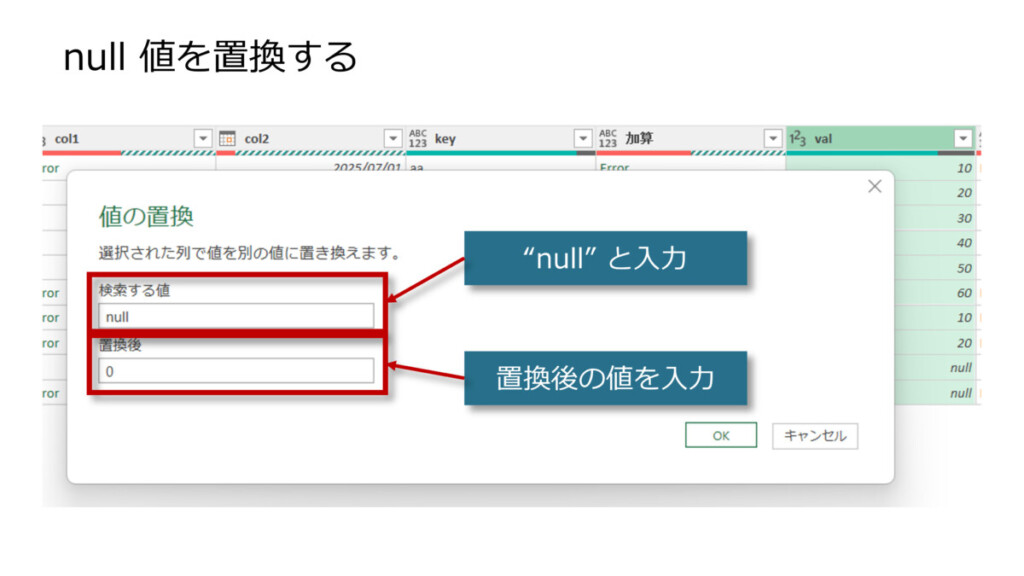 Power Query で設定した計算式は間違っていないのに、計算結果が null になってしまう というケースがあります。