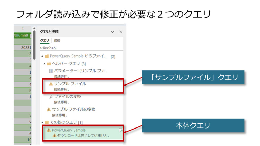 フォルダ読み込みの場合 は 2つのクエリの修正が必要 です。図の2つのクエリをそれぞれ開いて修正します。