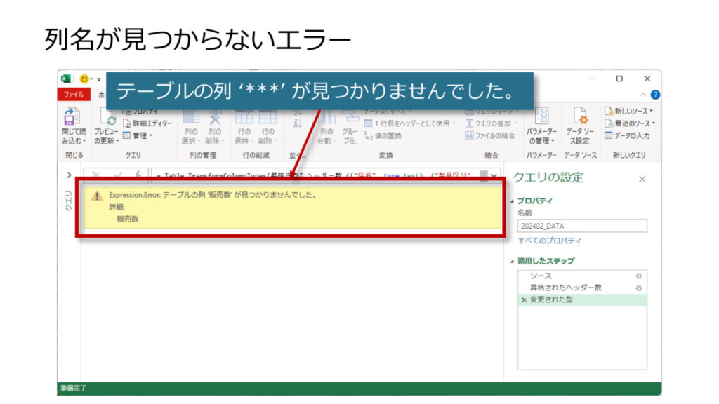 よくあるパターンとして Power Query が自動で追加した データ型設定のステップでエラーが発生 することがあります。