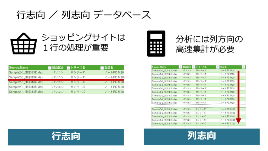 ショッピングサイトのように1件ごとの処理が重要なデータベースは1行の処理が速く確実である必要があります。このようなケースには 行志向データベース というものが活用されます。