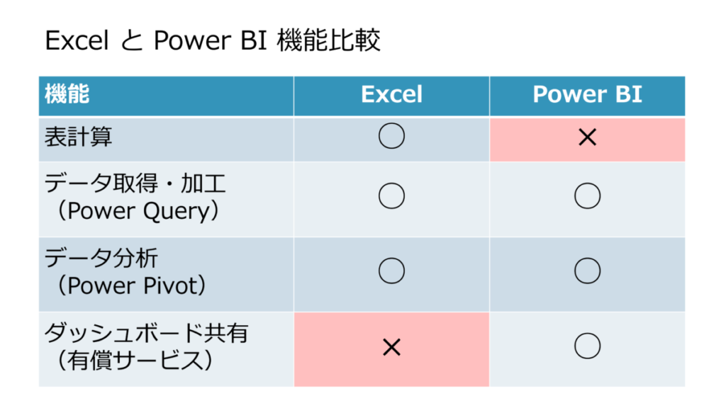 Excel に Power Query と Power Pivot が備わっているように、Power BI にも同じ機能が備わっています。ただし、Power BI には表計算の機能はありません。