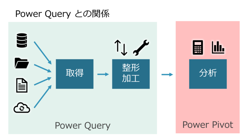 Power Query は「データを集めて、整える」役割を担うのに対して、Power Pivot は Power Query が整えたデータを受け取って、「データをモデリングし、分析する」役割を担っています。