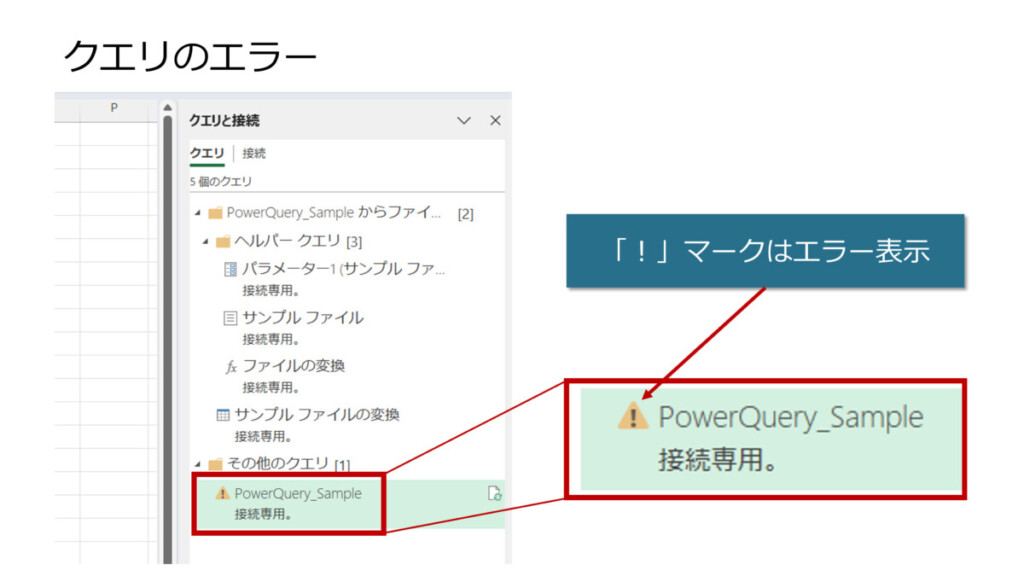 Power Queryの状態を見てみましょう。クエリ一覧を見ると「PowerQuery_Sample」のクエリでエラーが出ている ようです。