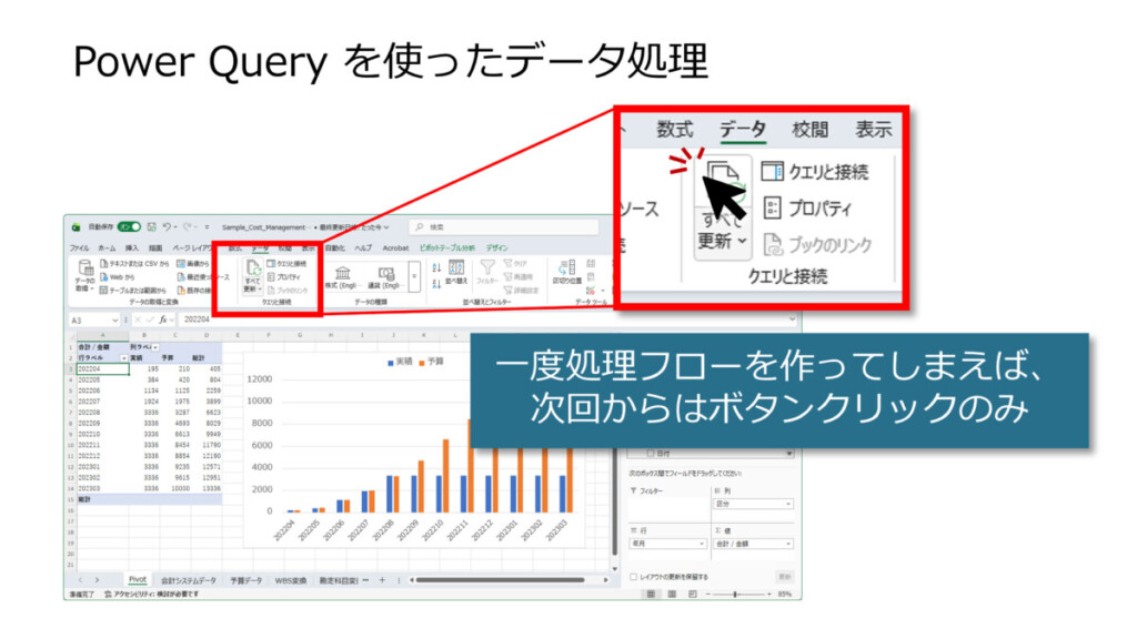 実際に、最新の経理システムのデータを入手してファイルを所定のフォルダに保管したら Power Query を組んだ Excel ファイルを開いて 「更新」ボタンを押すだけ で、予算と実績の比較表・グラフが一発で更新されてしまいます。