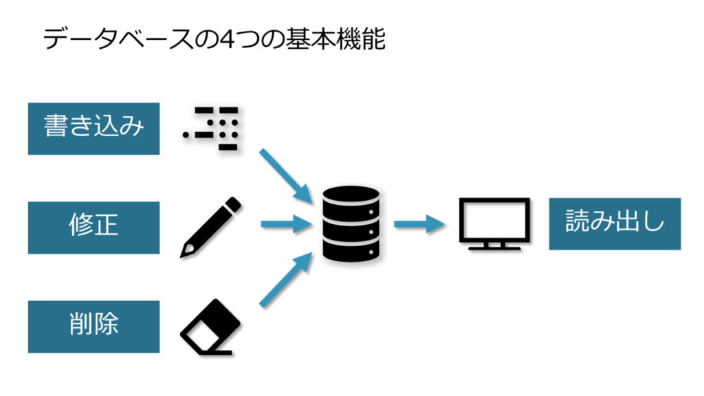 データベースはデータを保管するアプリケーションで、このために必要な機能は以下に示すたった4つしかありません。