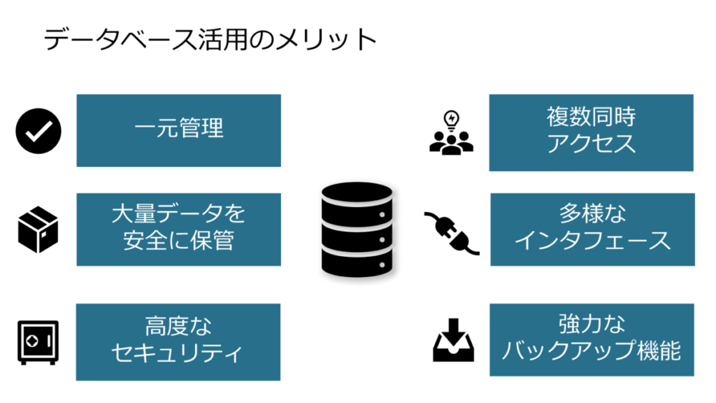 ここでデータベースを利用することの主な利点について整理しておきましょう。