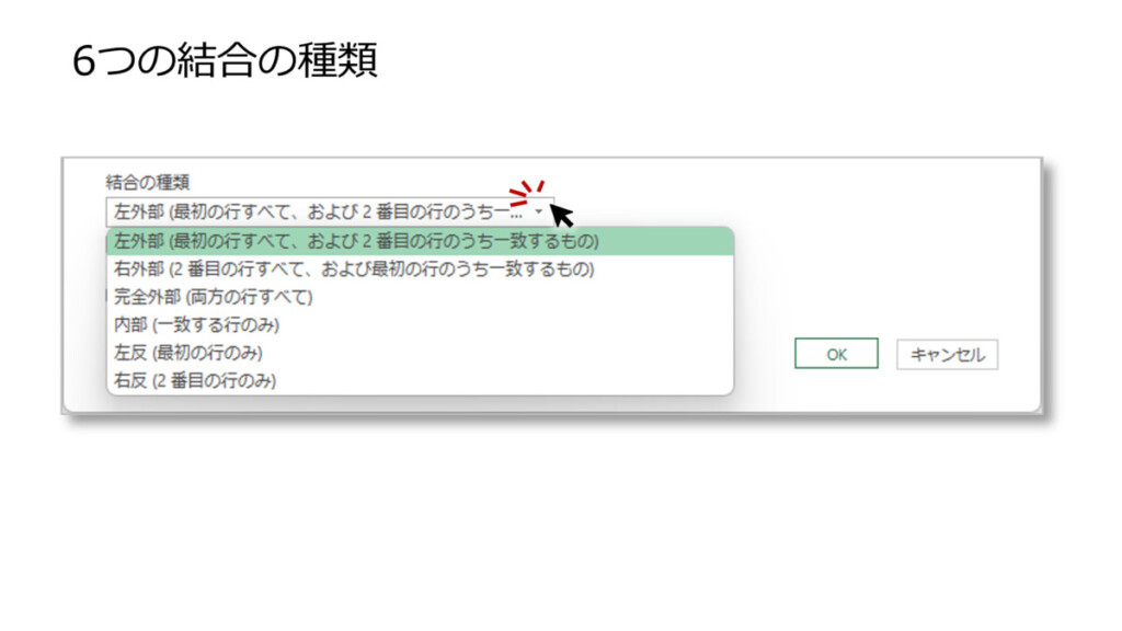 テーブル結合操作をする途中で図のようなウィンドウが開きます。ここで 結合の種類 を選択することができます。
