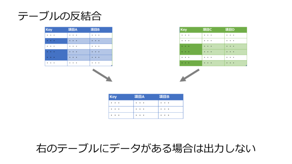 結合元のキー列が(’A’, ‘B’, ‘C’)で、結合させる側のキー列が(’B’)の場合は、出力は(’A’,’C’)となります。