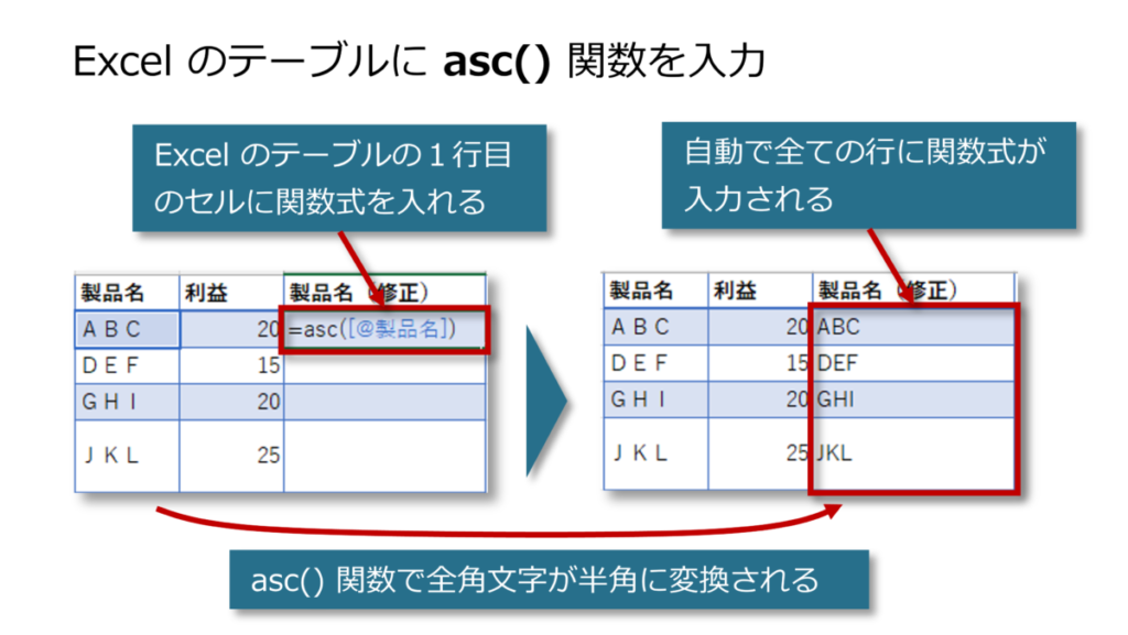 Excel の ASC() 関数を使うと全角文字を半角文字に変換することができます。しかも、漢字など半角に変換できない文字はそのままとなるのでエラーが起きにくいです。
