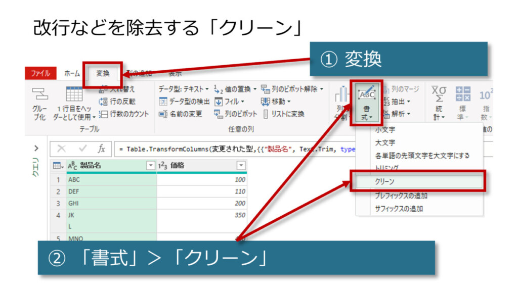 Power Query の クリーン 機能は 改行 や タブ などの制御文字を削除する機能です。