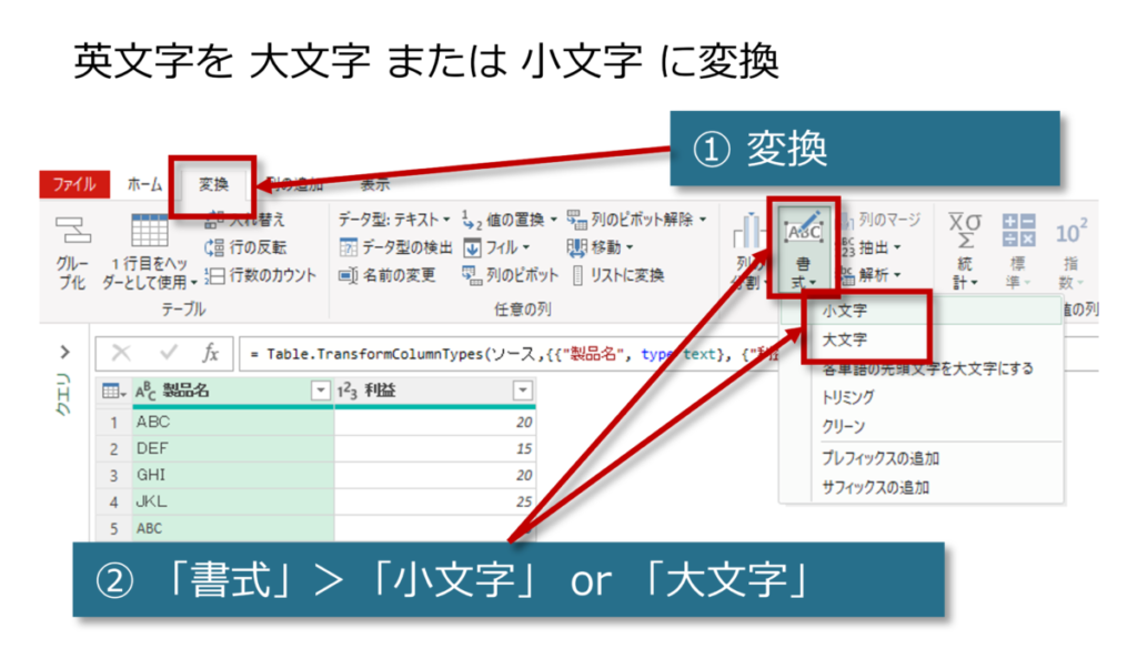 Power Query には英文字を 大文字や小文字に変換 する機能が搭載されていますのでこれを利用します。