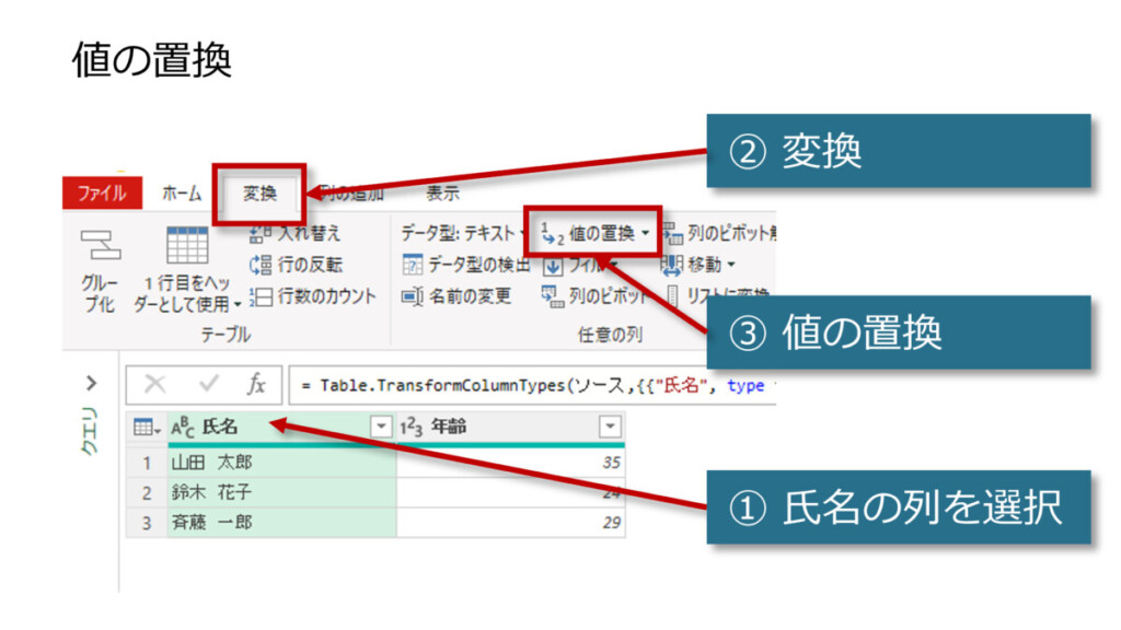 Power Query には文字列を置換する機能がありますので、これを使ってスペースを置換します。