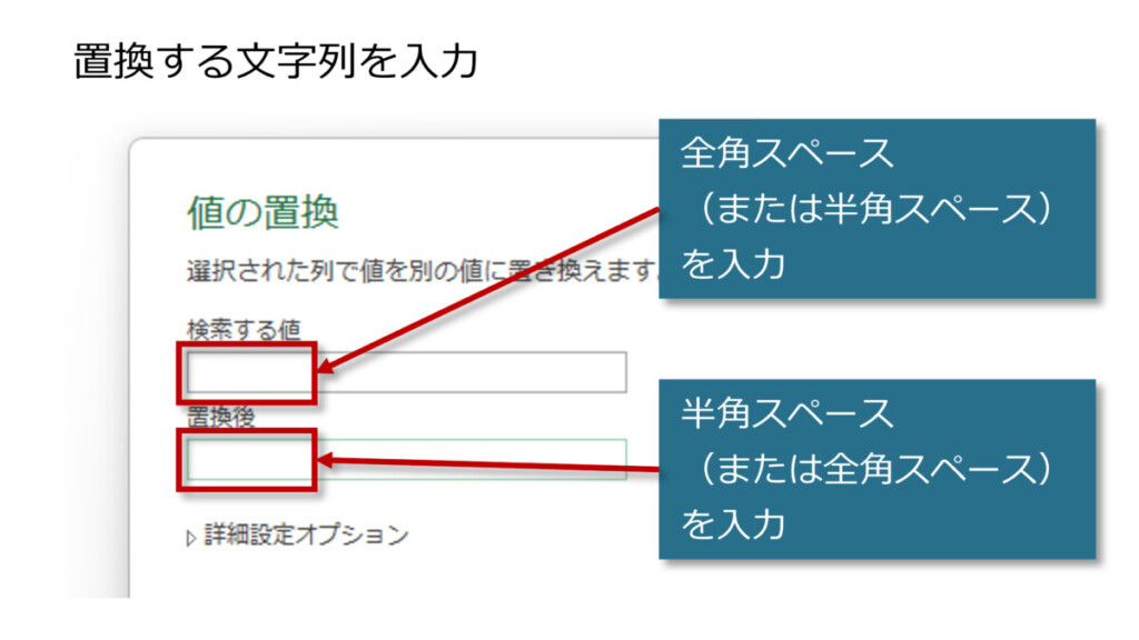 これで 全角(または半角)スペース を 半角(または全角)スペース に置換でき、結合ができるようになります。