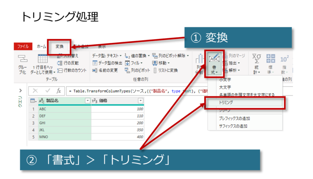 Power Query にはこのようなケースに備えて、「トリミング」機能が搭載されています。