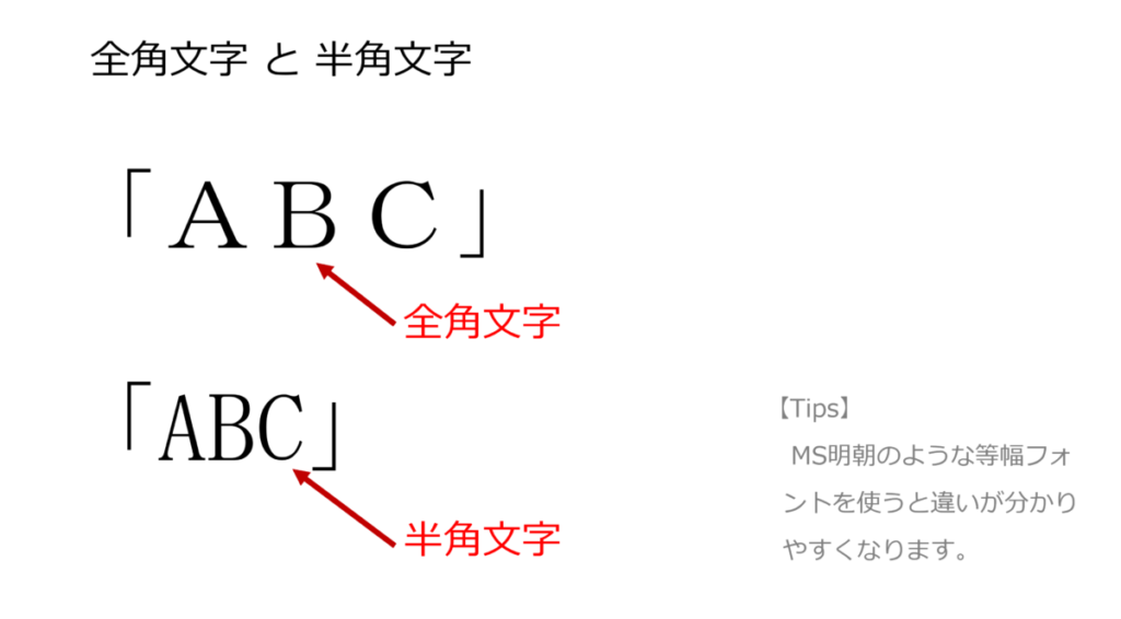 「ABC」 というテキストデータと 「ABC」 というテキストデータ、これは一見すると同じに見えますが、これは一方が 全角文字 で、もう一方が 半角文字 と異なっています。